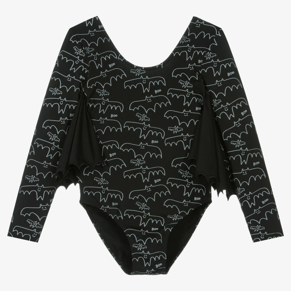 Black bat print bodysuit for teen girls by Stella McCartney Kids, with a spooky reflective bat and boo print. Made in silky and stretchy recycled fabric, the print is light reflective and there are attached wings under the arms, ideal for Halloween.