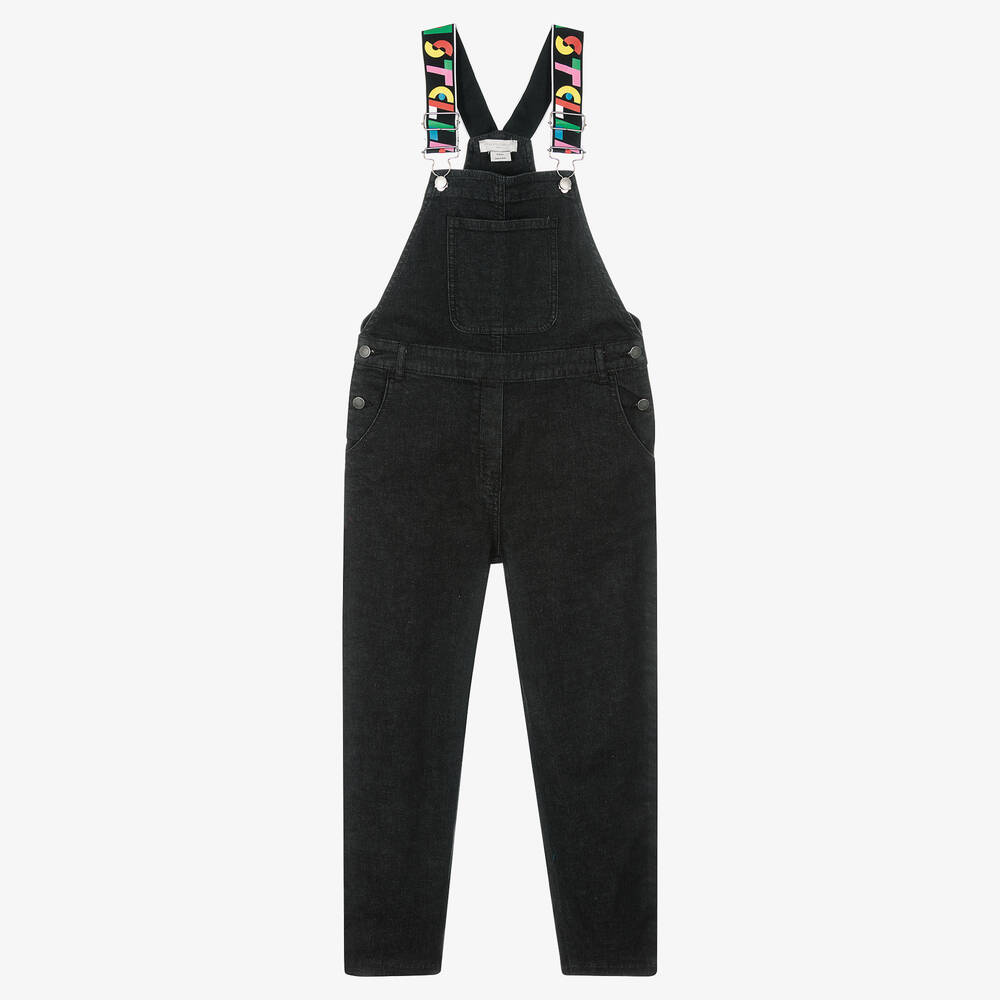 Black stretch denim dungarees for teen girls by Stella McCartney Kids. These relaxed-fit bib overalls are made in organic cotton and have colourful logo taping down the sides of the legs and on the elasticated, adjustable shoulder straps. There are side button fastenings, a front patch pocket and two on the back.
