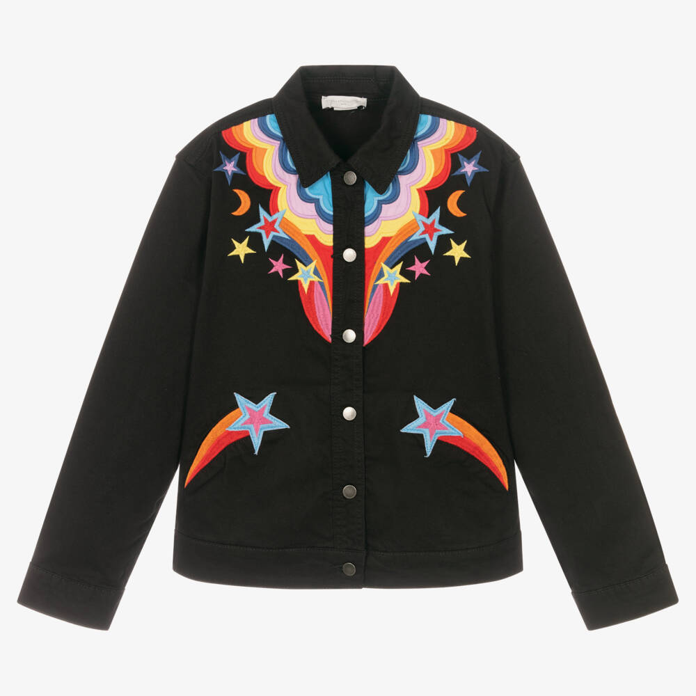 Stretch denim jacket by Stella McCartney Kids for teen girls. With a nod to Western style cowboy embroidery in cosmic rainbow colours, the gabardine jacket has a classic collar and branded button fastenings down the front and at the sides. There are side pockets above the shooting stars embroidery.