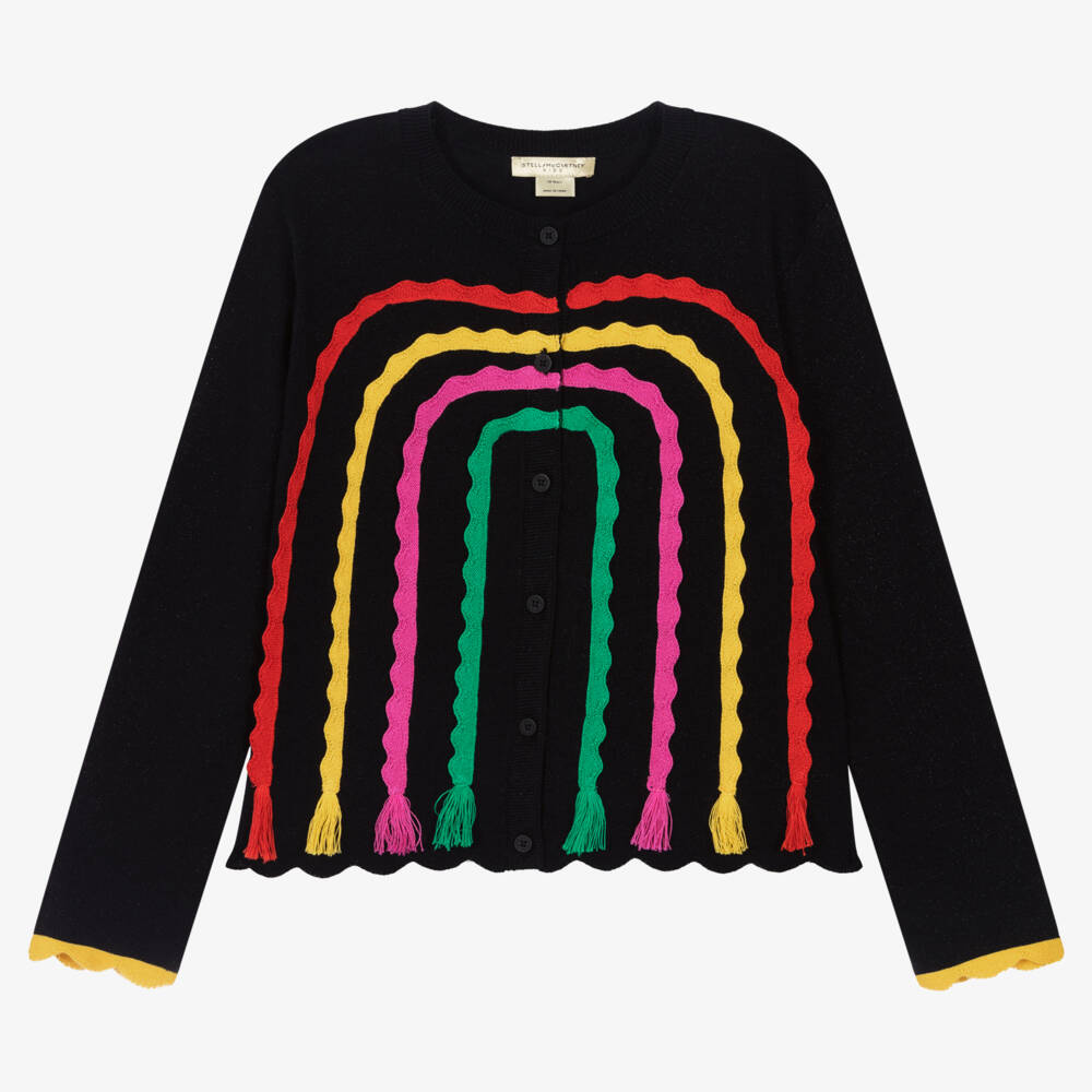 In an eye-catching glittery knit, this black cardigan for teen girls is from British designer Stella McCartney Kids. It has a vibrant tasselled rainbow decorated on the front, with elegant scalloped trims. Made from a soft organic cotton blend, there are branded button fastenings on the front. The Stella McCartney fit can be quite small so choose a size up if you want room to grow.