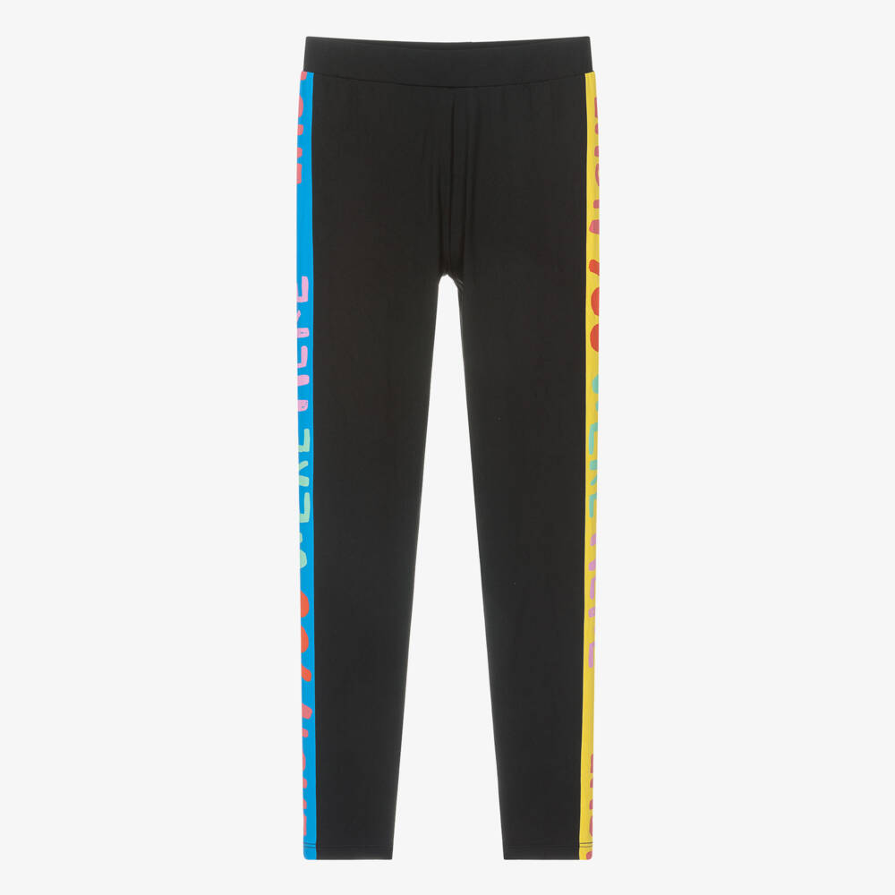 Sporty and stylish, these black leggings for teen girls are by British label Stella McCartney Kids. A colourful 'Wish You Were Here' slogan is printed on each side for a striking look. They are made in a smooth and stretchy recycled fabric with an elasticated waistband, great for lounging. The Stella McCartney fit can be quite small so choose a size up if you want room to grow.