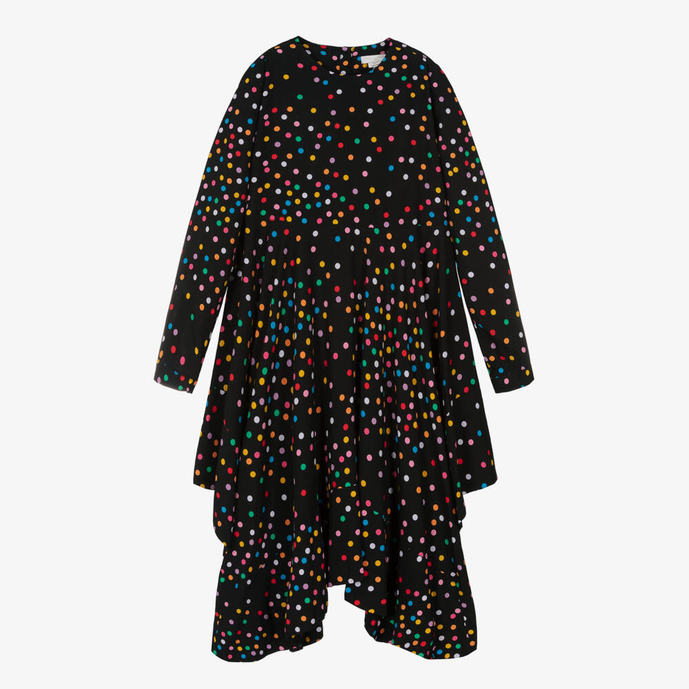 Lovely black dress for teen girls from Stella McCartney Kids, made in sustainably sourced viscose. Soft and lightweight, it is patterned with sweet polka dots in an array of vibrant colours. The stylish, asymmetric hem finishes above the knee and at the ankle. There are buttons on the back and cuffs to fasten.