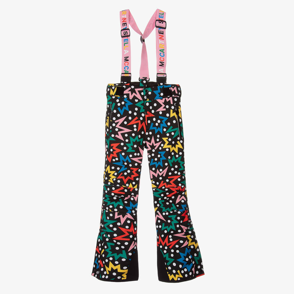 With a bright and colourful star pattern, these black ski trousers for teen girls are by Stella McCartney Kids. Made from a smooth, quick-drying recycled fabric, they are both waterproof and windproof, with a soft fleece lining for extra warmth. For a distinctive designer look, they come with pink detachable and adjustable logo shoulder straps. They fasten with branded poppers and a zip and have adjustable velcro tabs on the waistband. To help keep out the snow, there are internal elasticated gaiters and zip and popper fastenings on the hems. Useful zip-up pockets, complete the practical design. The Stella McCartney fit can be quite small so choose a size up if you want room to grow.