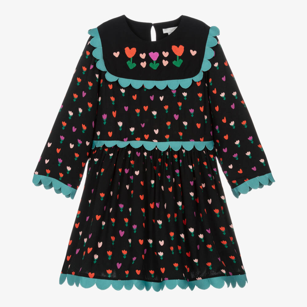 Playful and stylish, this black dress for teen girls is from Stella McCartney Kids. Made in lightweight viscose, it is patterned with pink, red and green tulips and hearts, with matching embroidery on the bodice. For a pretty finish, it has scalloped green trims, a keyhole button fastening on the back and a gathered skirt with concealed pockets on the sides. The Stella McCartney fit can be quite small so choose a size up if you want room to grow.