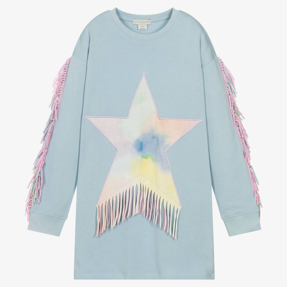 Pale blue sweatshirt dress for teen girls from Stella McCartney Kids. It has a large tie-dye effect star on the front in purple, orange and pink pastel shades, with matching fringing below. For an extra fun touch, there is pink, blue and green fringing down each sleeve. This lovely dress has cosy ribbed trims, concealed side seam pockets and simply pulls on over the head. This casual dress is made in soft and comfortable organic cotton jersey with a cosy fleecy inside for extra warmth. The Stella McCartney fit can be quite small so choose a size up if you want room to grow.