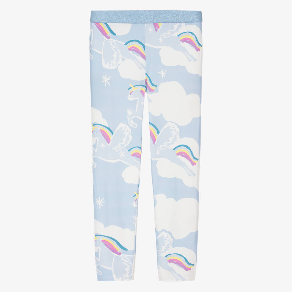 Pale blue, organic cotton, full length leggings for teen girls by British brand Stella McCartney Kids. They are patterned with fun white unicorns that have rainbow manes and tails, flying through clouds. Made in comfortable jersey, they have an elasticated waistband with an eye-catching glittery sparkle. The Stella McCartney fit can be quite small so choose a size up if you want room to grow.