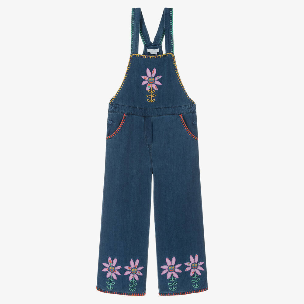Gorgeous blue dungarees for teen girls by British designer Stella McCartney Kids. They have fun appliqué flowers on the bib and cuffs, with happy, embroidered faces, and colourful blanket stitch trims, creating a homespun, folklore look. Comfortable to wear, they are made in super soft organic cotton denim, with logo side button fastenings, adjustable shoulder straps and a loose, wide-legged style. These casual but stylish dungarees have both front and back pockets. The Stella McCartney fit can be quite small, so choose a size up if you want room to grow.