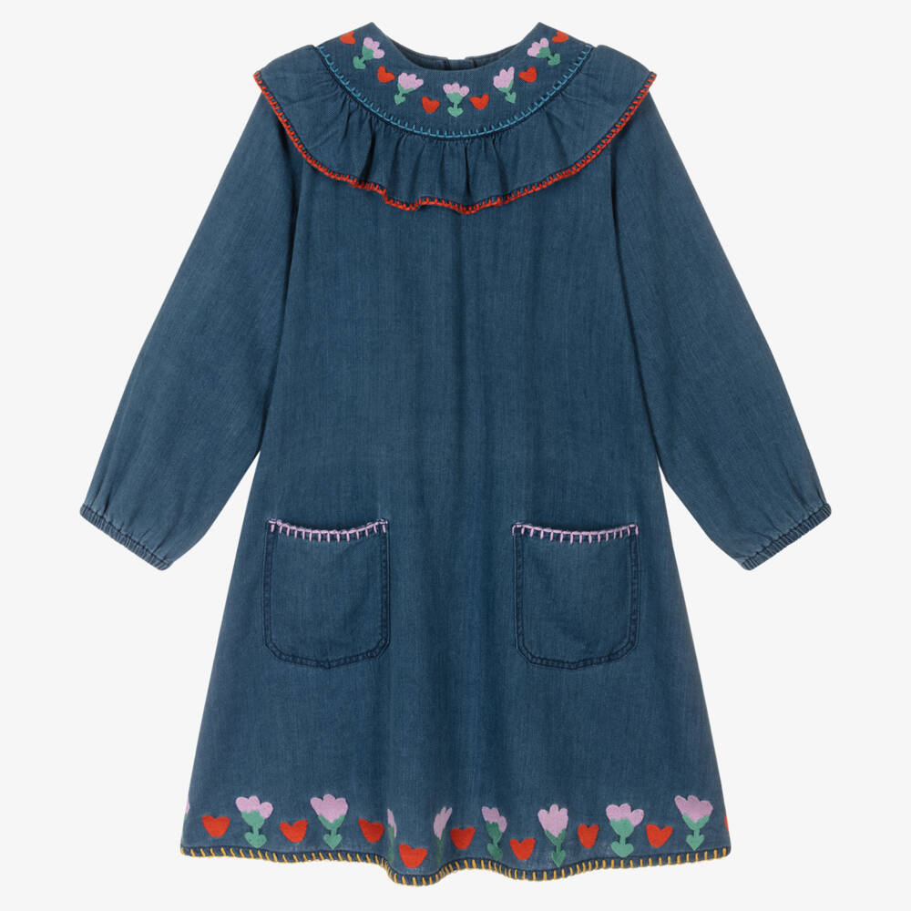 Delightful blue dress for teen girls by British designer Stella McCartney Kids. For homespun, folklore appeal, it is exquisitely embroidered with pink flowers and red hearts. There is colourful blanket stitching on the ruffle around the neck, the front patch pockets and the hemline. So comfortable to wear, it is made in super soft, organic cotton denim and has an exposed zip fastening around the back. The Stella McCartney fit can be quite small, so choose a size up if you want room to grow.