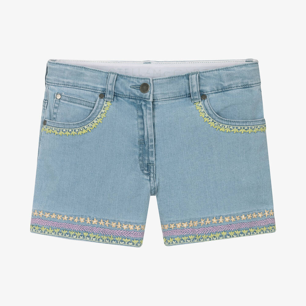 In a light blue wash with pretty pastel embroidery on the front and back, these denim shorts for teen girls are by British brand Stella McCartney Kids. Made in comfortable, stretchy organic cotton, they fasten easily with a hook and eye that has a decorative logo button over and a zip. This five pocket design is trimmed with rivets on the front and has a branded patch on the back for a designer finish.