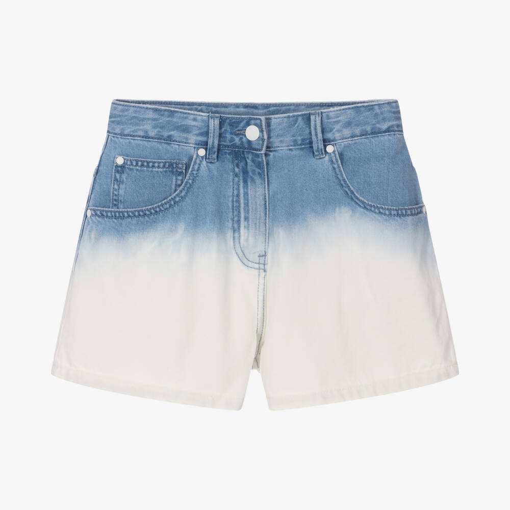 Blue and white ombré denim shorts for teen girls, by Stella McCartney Kids, with a logo tab on the back of the waist. Fastening with a zip and a metal clasp, these stylish shorts have a cool faded look and are made in soft organic cotton. The buttons and rivets on the front are all embossed with the designers logo for a discreet branded finish. The Stella McCartney fit can be quite small so choose a size up if you want room to grow.