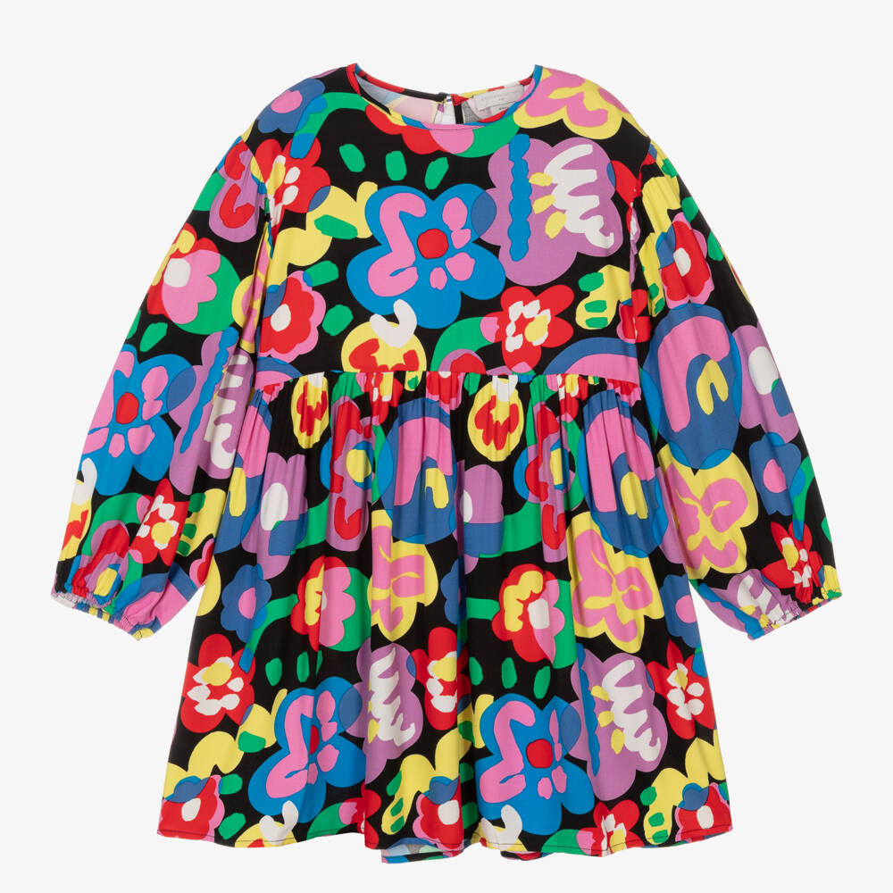 Brimming with vibrant personality, this black viscose dress for teen girls is by British designer Stella McCartney Kids. It has a colourful abstract flower print, in the brand's typical style and an elasticated waist and cuffs that create a beautiful silhouette. There is a keyhole detail on the back which fastens with a button.