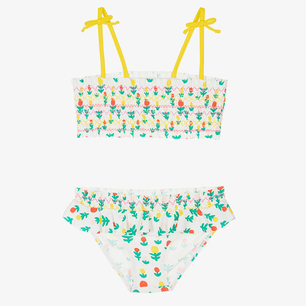 Patterned in a pretty red and yellow flower print, this white bikini for teen girls is by Stella McCartney Kids. Made from recycled fibres, the fabric is silky smooth and stretchy, and has a UPF50+. Elasticated and fully lined for comfort, the top has yellow shoulder straps with fixed bows on the shoulders. The bottoms have an elasticated waist and a feminine ruffle trim.
