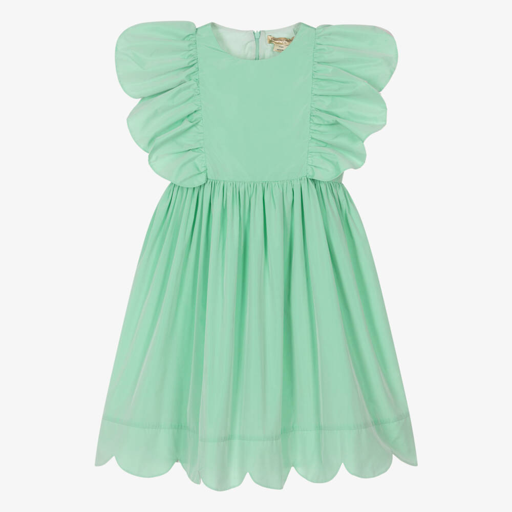 From Stella McCartney Kids, a gorgeous pastel green dress for teen girls. A classic occasion style, it is made from smooth taffeta with a beautiful lustrous sheen. The sleeveless bodice has statement ruffle trims with petal-effect scalloped edging to match the hem of the full, gathered skirt. The dress is comfortably lined in lightweight cotton and fastens neatly with a concealed zip on the back. The Stella McCartney fit can be quite small so choose a size up if you want room to grow.