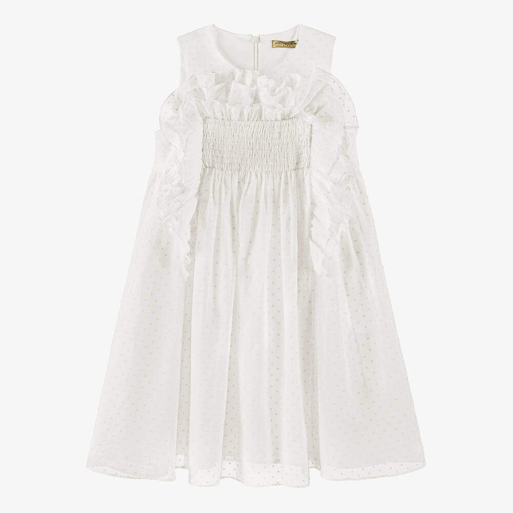 So beautiful for teen girls, a pale ivory organic cotton dress from British brand, Stella McCartney Kids. Ideal for warmer days, this sleeveless occasion style is made in lightweight voile with a raised dot pattern and has a smocked panel on the front, trimmed with delicate ruffles. It fastens neatly with a concealed zip on the back and is fully lined for comfort. The Stella McCartney fit can be quite small so choose a size up if you want room to grow.