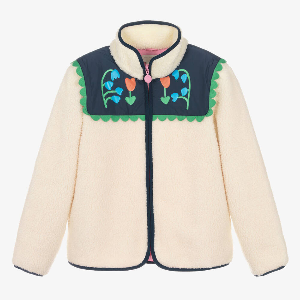 In stylish sherpa fleece, this ivory jacket for teen girls is from Stella McCartney Kids. For a bohemian folklore-inspired look, it has graphic tulips patterned on the silky navy blue panel, with green scalloped edging. It has a chunky pink zip fastening with a logo charm and a bold pink satin lining. Stretchy navy blue piping finishes its design. The Stella McCartney fit can be quite small, so choose a size up if you want room to grow.