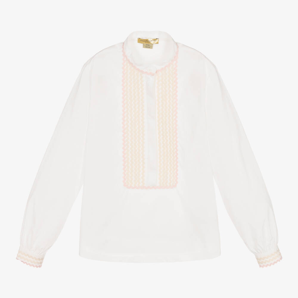 Romantically styled, a white organic cotton poplin blouse for teen girls, by Stella McCartney Kids. In delicate beige and pale pink hues, ric rac trims decorate the bodice and cuffs for a feminine style. A logo-embossed button is featured on the collarless trim, and there is a button-up placket beneath to create clean lines. The Stella McCartney fit can be quite small so choose a size up if you want room to grow.