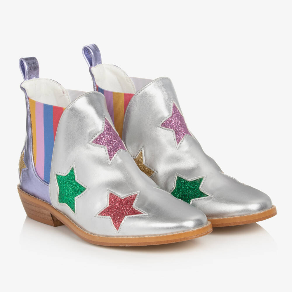 Eye-catching metallic silver boots for teen girls by Stella McCartney Kids, made from soft faux leather. In an easy pull-on style, they are decorated with glittery star inserts and have elasticated panels on the sides in rainbow stripes. They have a small heel and a lightly textured, non-slip outer sole for improved grip.