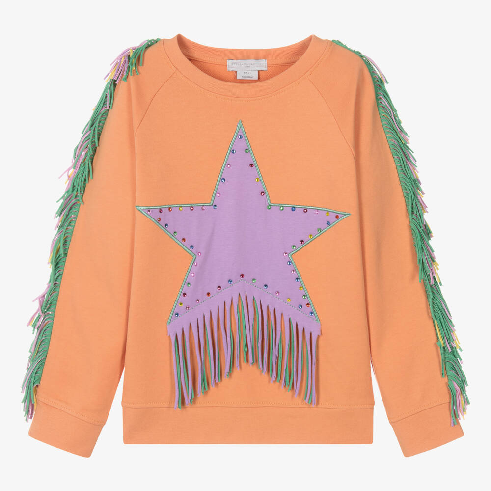An orange long-sleeved sweatshirt for teen girls by Stella McCartney Kids, styled with multicoloured fringing on the arms. Made from organic cotton jersey, this mid-weight layering piece has casual raglan sleeves and a gently ribbed neckline. There is an oversized lilac purple star on the front, beautifully decorated with brightly coloured diamanté. The Stella McCartney fit can be quite small so choose a size up if you want room to grow.