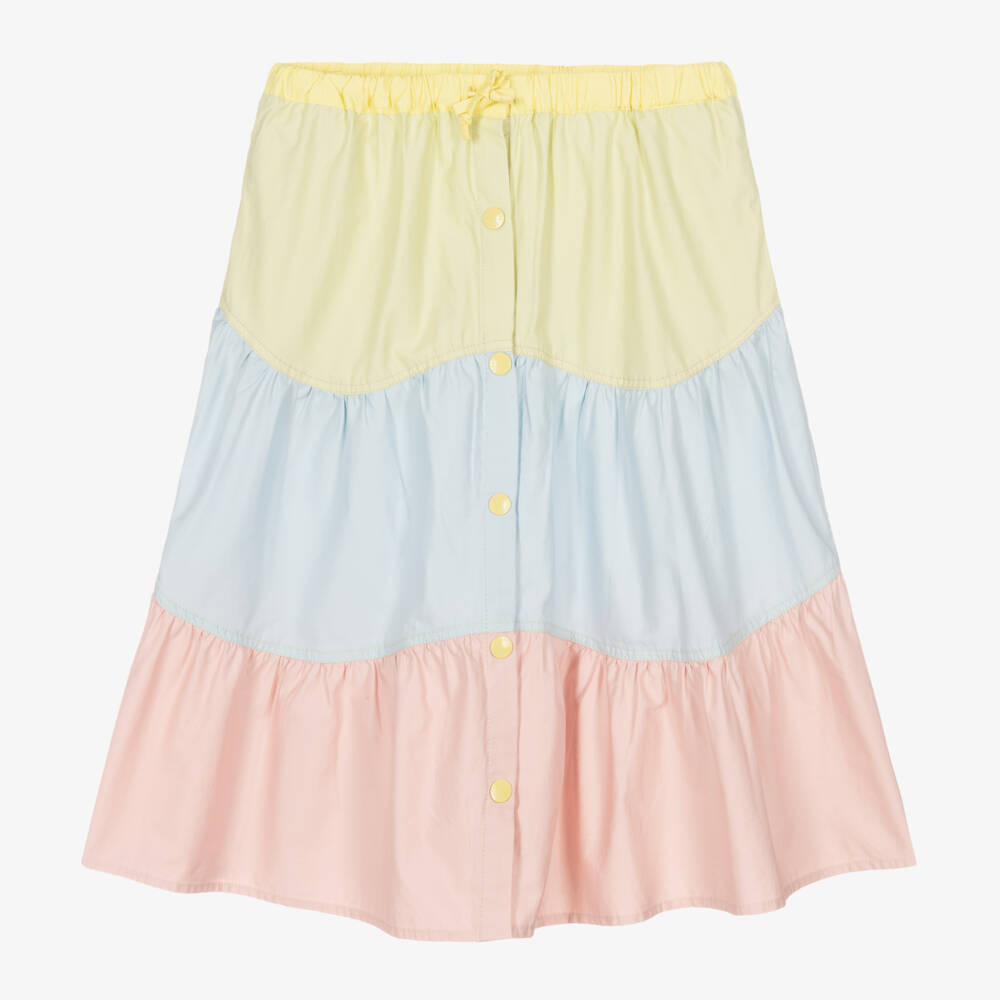 A fun colourblock skirt for teen girls by British fashion designer Stella McCartney Kids, designed in pretty pastel shades. Made in organic cotton poplin, this tiered design has a gently elasticated waist with practical drawstring ties for a customised fit. Concealed side seam pockets and branded popper fastenings on the front add to the style. The Stella McCartney fit can be quite small so choose a size up if you want room to grow.