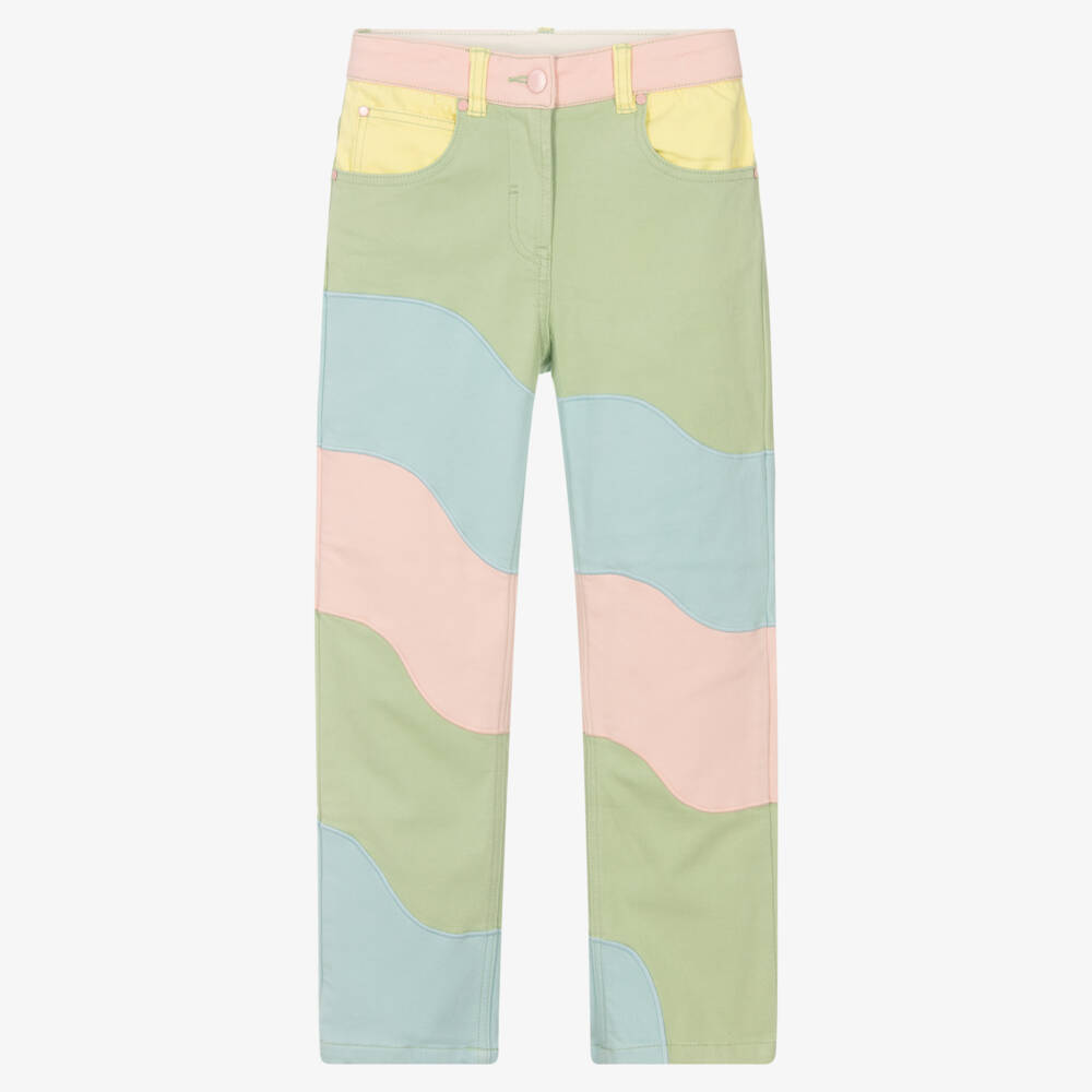 In pastel shades of pink, blue and green, these striped jeans for teen girls are by British brand Stella McCartney Kids. Made in stretchy, organic cotton denim with belt loops, they are super comfortable and easy to wear. This classic five-pocket design is trimmed with pink rivets and fastens with a hook and eye on the front, with a faux logo button on top. There is a branded patch on the back for a designer finish.