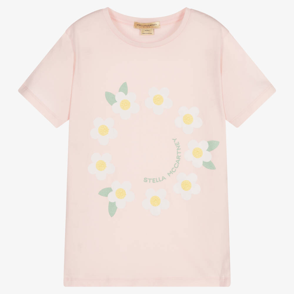 From British brand Stella McCartney Kids, pink T-shirt for teen girls with a sweet daisy chain print on the front. Each daisy is finished with delicate embroidery and the brand logo is printed in green for an extra designer touch. Made in soft organic cotton, this jersey tee is stylish and comfortable. The Stella McCartney fit can be quite small so choose a size up if you want room to grow.