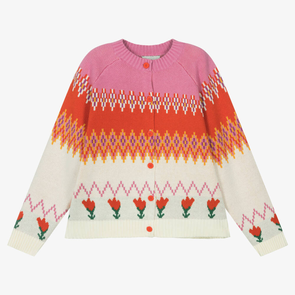 Bold and Bohemian, a pink, red and ivory cardigan for teen girls by Stella McCartney Kids. This knitted layer has a gorgeous Fair Isle design, with floral tulips patterned beneath. Made from an organic cotton and wool blend, it has a ribbed crew neck and branded button fastenings. The Stella McCartney fit can be quite small so choose a size up if you want room to grow.