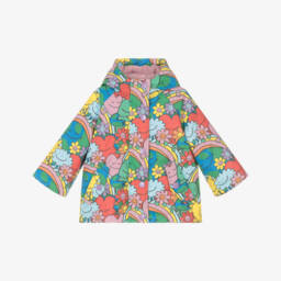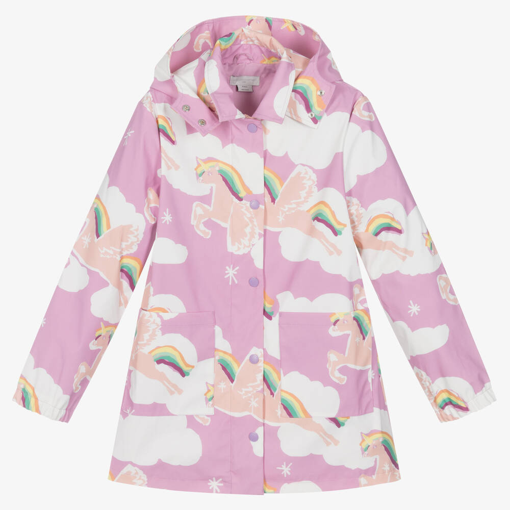 A delightful lilac-pink raincoat for teen girls by Stella McCartney Kids, with a rainbow unicorn print. In dreamy pastel shades, this water-resistant coat has a branded popper fastening placket with a useful zip on the front. It is finished with a hood, patch pockets and a silky smooth lining for added comfort. The Stella McCartney fit can be quite small so choose a size up if you want room to grow.