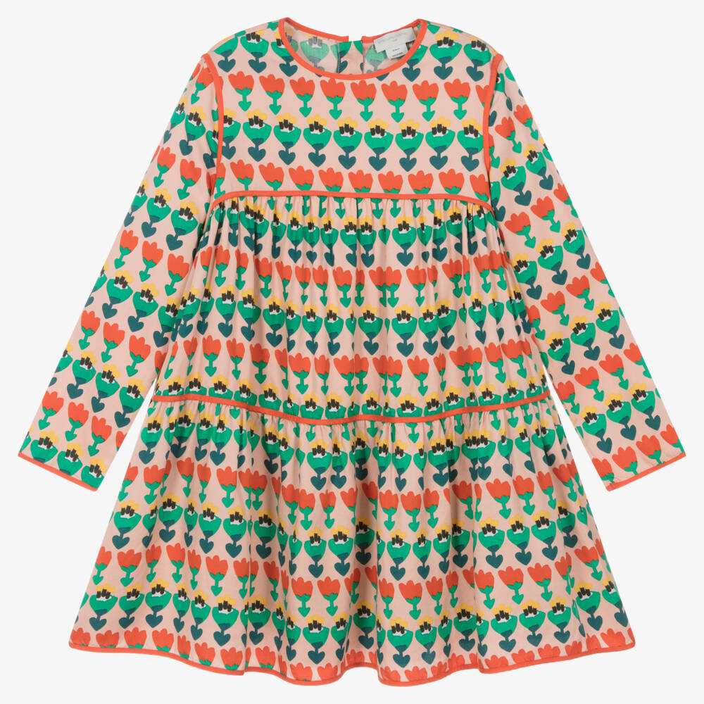 A pink long-sleeved dress for teen girls by British designer Stella McCartney Kids, printed with rows of red and green tulips. From the brand's Folklore collection, this tiered style is made in beautifully soft and eco-friendly lyocell for natural comfort. It has defining red trims, an exposed zip fastening on the back and side seam pockets. The Stella McCartney fit can be quite small so choose a size up if you want room to grow.