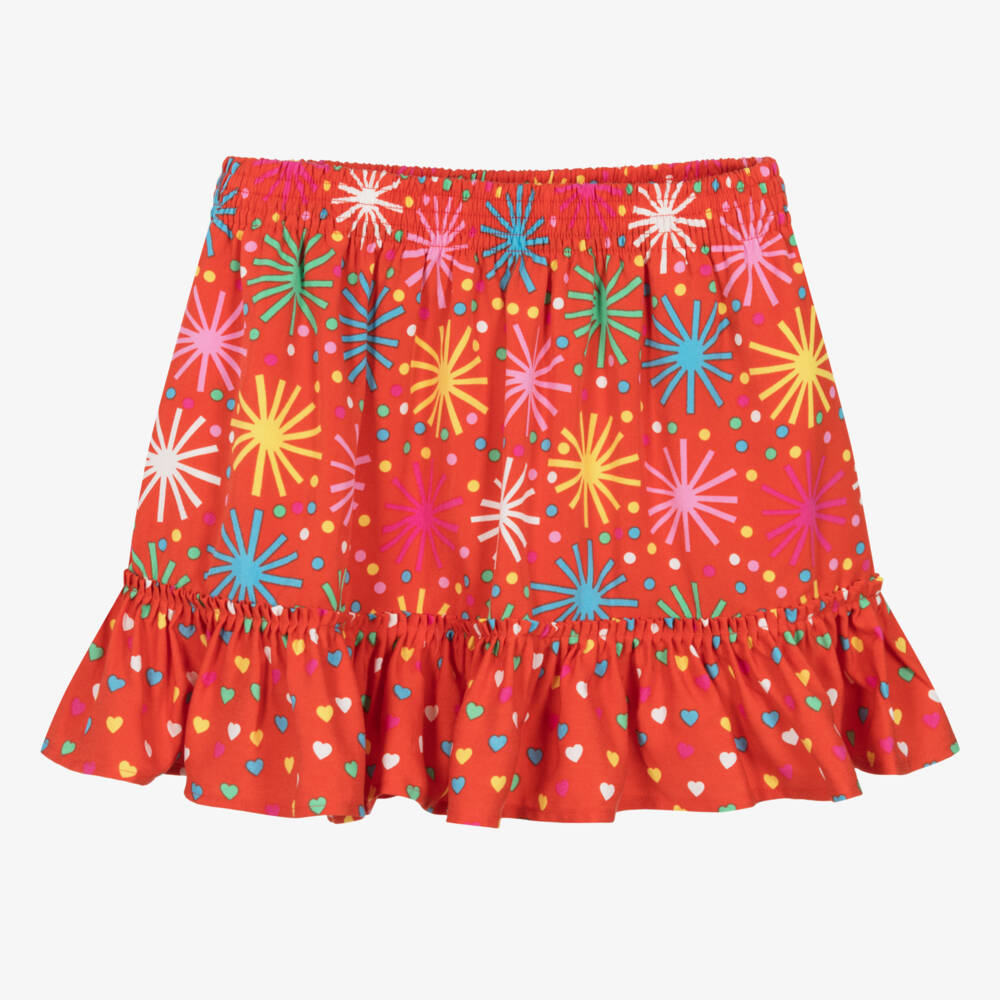 Red mini skirt for teen girls by British label Stella McCartney Kids. Super comfortable in soft twill, it is patterned with colourful firework prints on a dotted background. Decorated with hearts, the ruffle hem adds a little extra flounce to her outfit. The elasticated waist ensures a comfortable fit and the concealed side pockets are great for small essentials. This skirt is made from environmentally friendly lyocell. The Stella McCartney fit can be quite small so choose a size up if you want room to grow.