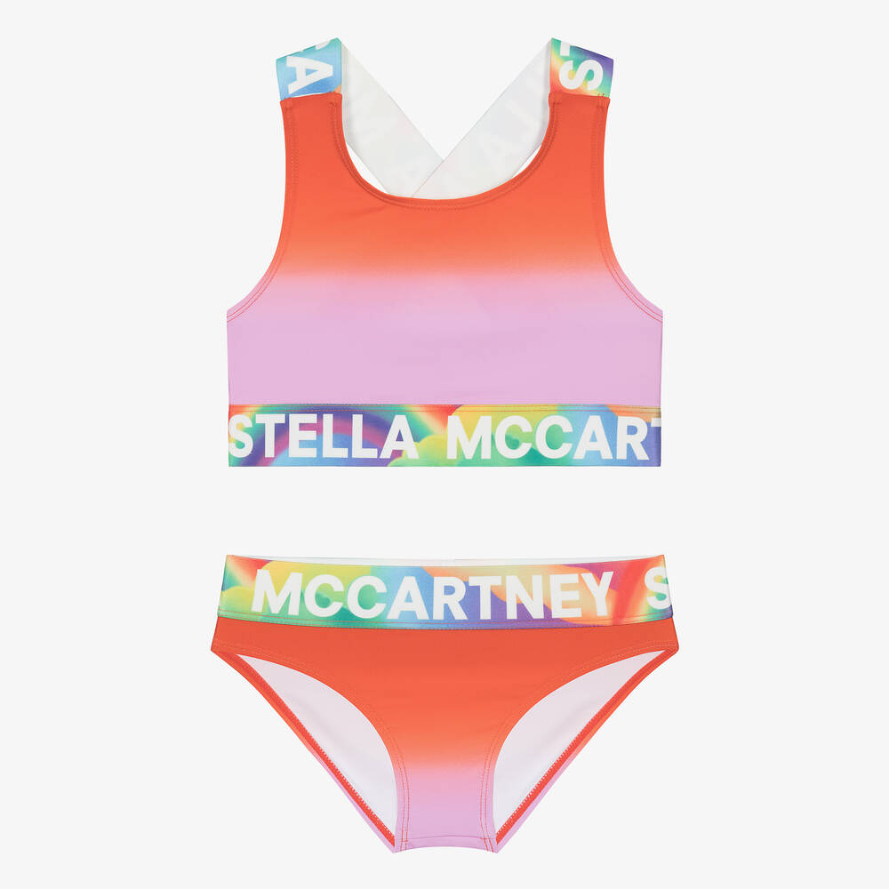 A bikini for teen girls by Stella McCartney Kids, in lilac pink and red ombré. With UPF50+, this smooth-stretch bikini has bright rainbow-coloured logo tape trims. The top half has cross-over straps and a stretchy hem, whilst the bikini bottoms have an elasticated waist for lasting comfort. The Stella McCartney fit can be quite small so choose a size up if you want room to grow.