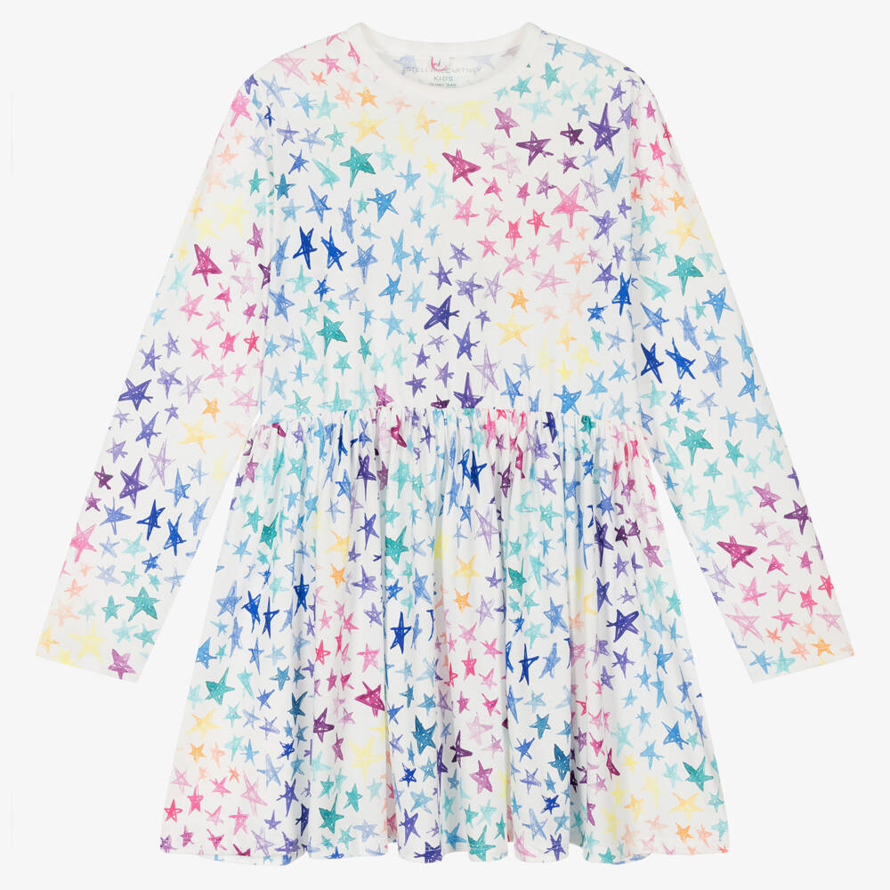 Off-white dress for teen girls by Stella McCartney Kids, printed with doodled stars in shades of blue, pink and yellow. Made in soft and stretchy organic cotton jersey, this comfortable pull-on dress has a rounded neckline and long sleeves. The Stella McCartney fit can be quite small so choose a size up if you want room to grow.