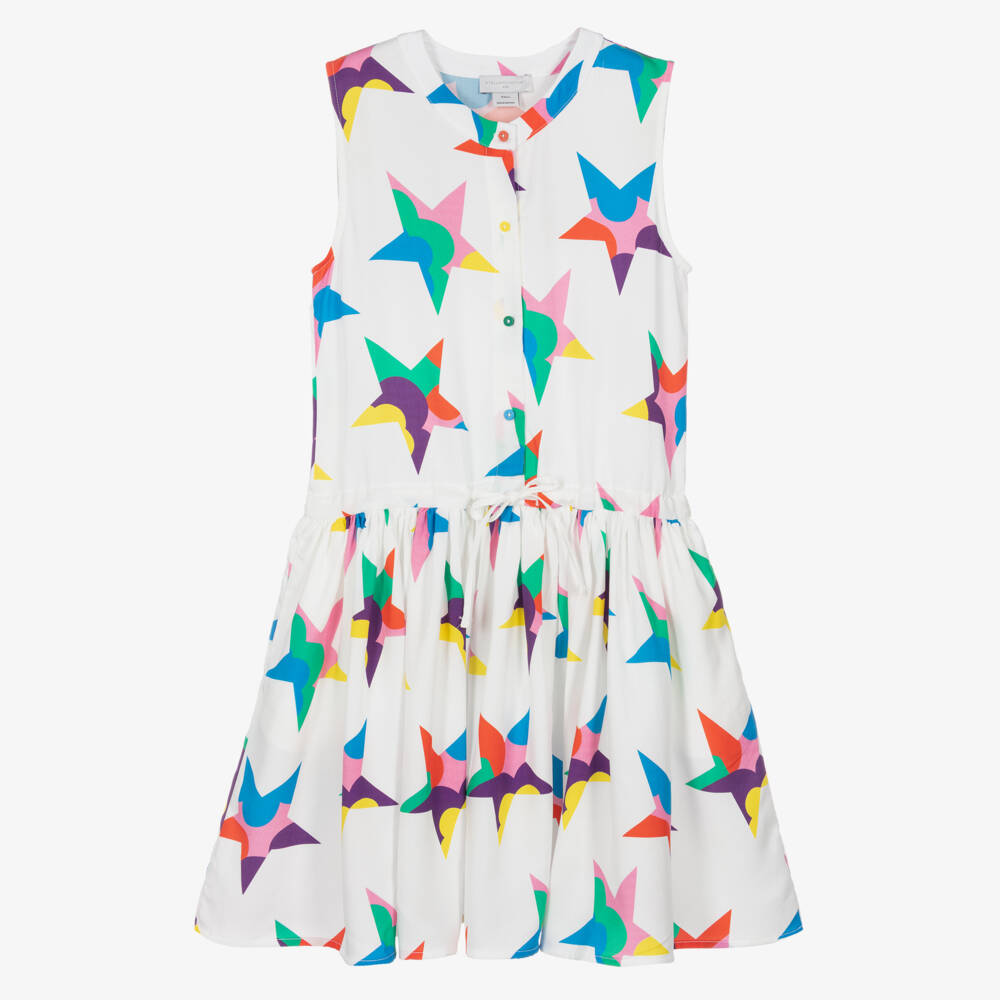 From Stella McCartney Kids, white twill dress for teen girls with a fun vibrant star print. The branded button fastenings are all different colours for a quirky finish. For a stylish silhouette, it is sleeveless with a dropped waist and a loose-fitting skirt with useful pockets concealed in the side seams. The waist can be cinched with a drawstring for a feminine look. The Stella McCartney fit can be quite small so choose a size up if you want room to grow.