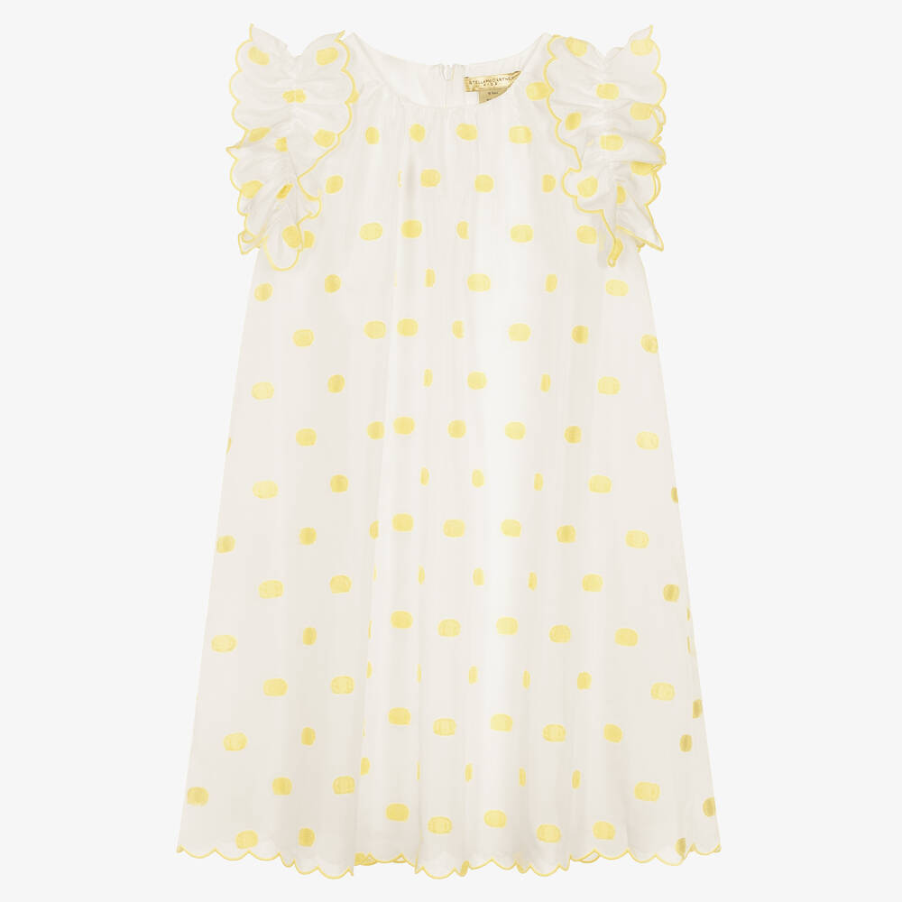 White dress for teen girls by Stella McCartney Kids, with embroidered yellow polka dots. Made in beautifully lightweight satin from recycled fibres, this elegant sleeveless style is gathered from the neckline to create a subtle A-line shape. To complete the look, there are pretty ruffles on the shoulders with embroidered scalloped edging to match the hem. The dress is lined in lightweight cotton for comfort and fastens neatly with a concealed zip on the back. The Stella McCartney fit can be quite small so choose a size up if you want room to grow.