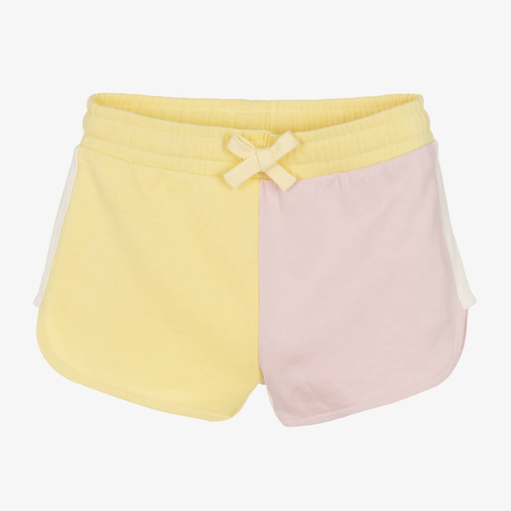 Super cool, these yellow cotton shorts for teen girls are by Stella McCartney Kids. In a lovely colour block style, one leg is pale pink, there are white stripes down the sides, and a fun cherry design is printed on the back pocket. Made from mid-weight organic cotton jersey, they have an elasticated drawstring waist for a comfortable fit. The Stella McCartney fit can be quite small so choose a size up if you want room to grow.