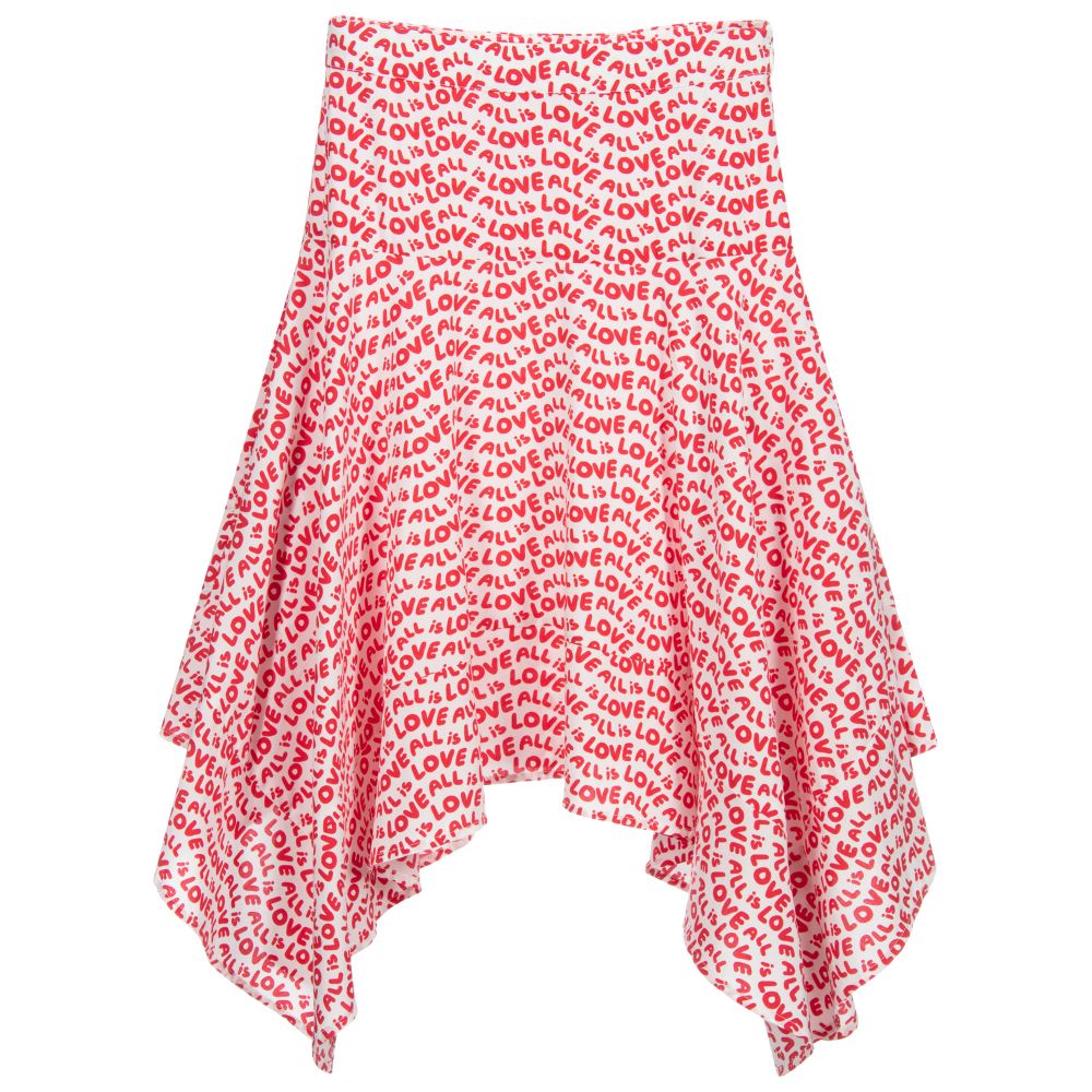 Directly inspired by the adult collection, a white skirt by Stella McCartney Kids with a red 'All is Love' Mini-me print. Lovely for teen girls, this exclusive skirt is made in lightweight viscose and has a asymmetric handkerchief hem. There are pockets in the side seams and an adjustable waistband.