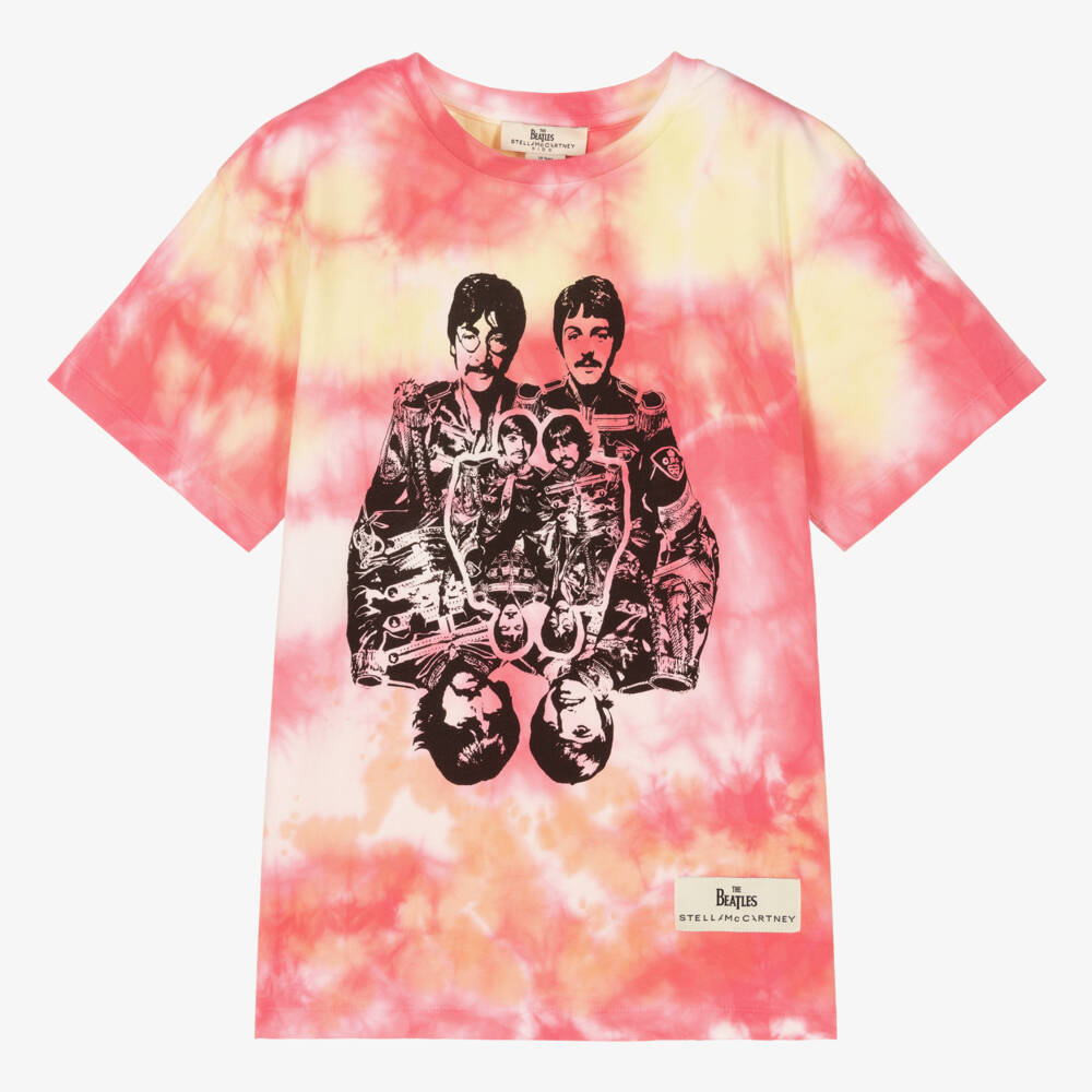 Vibrant yellow and pink T-shirt for teen boys and girls from Stella McCartney Kids, made in soft and stretchy cotton jersey. As seen in the main collection, it forms part of 'Get Back' Beatles theme, named after a track from the band's final album. It has The Beatles printed in black on the front and a logo badge on the hem.
