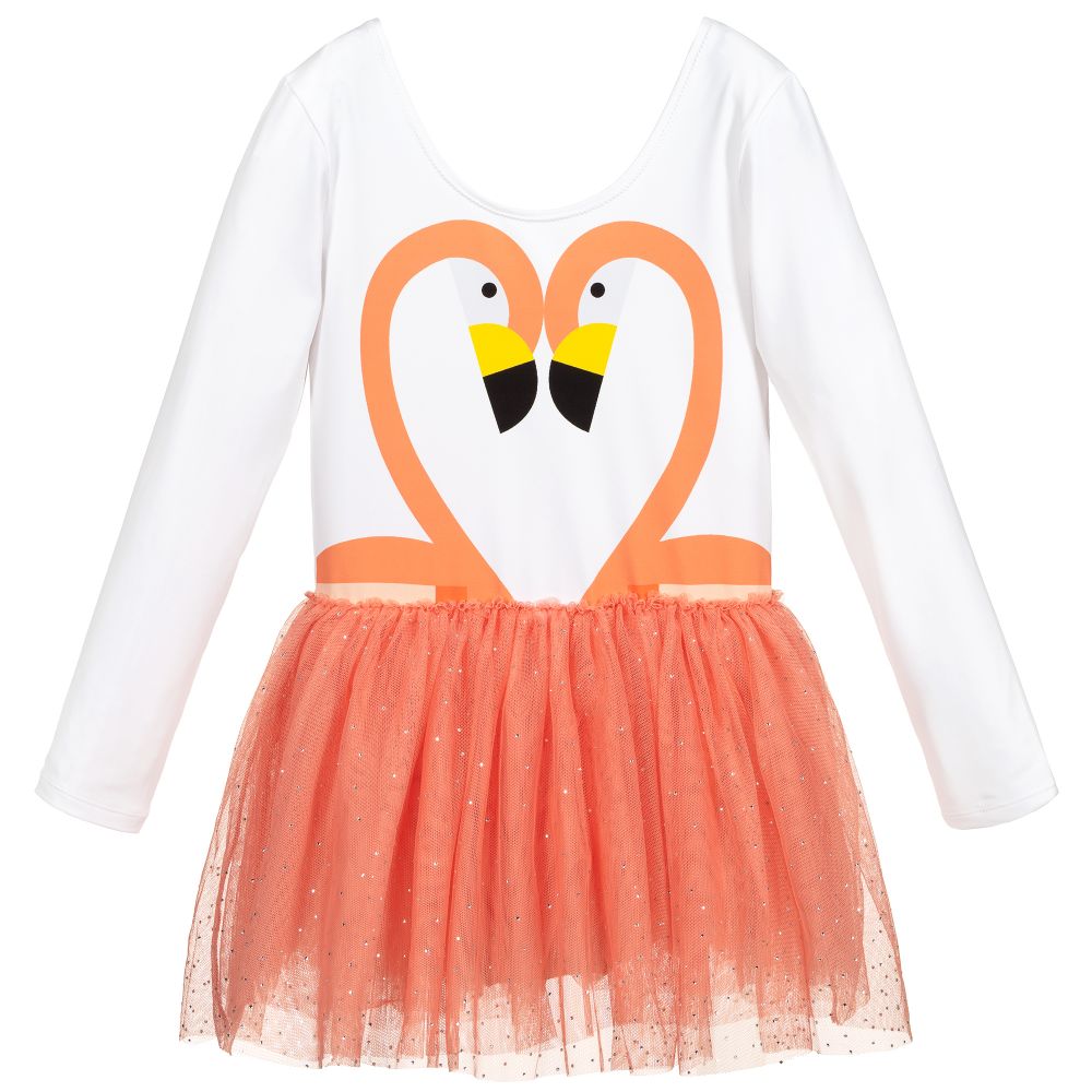 Sweet dress for girls by British designer Stella McCartney Kids, with the look of a two piece. The white top part is made in stretchy jersey and has pretty pink flamingos printed on the front. The sparkling pink skirt is made up of layers of tulle and has attached pink knickers.