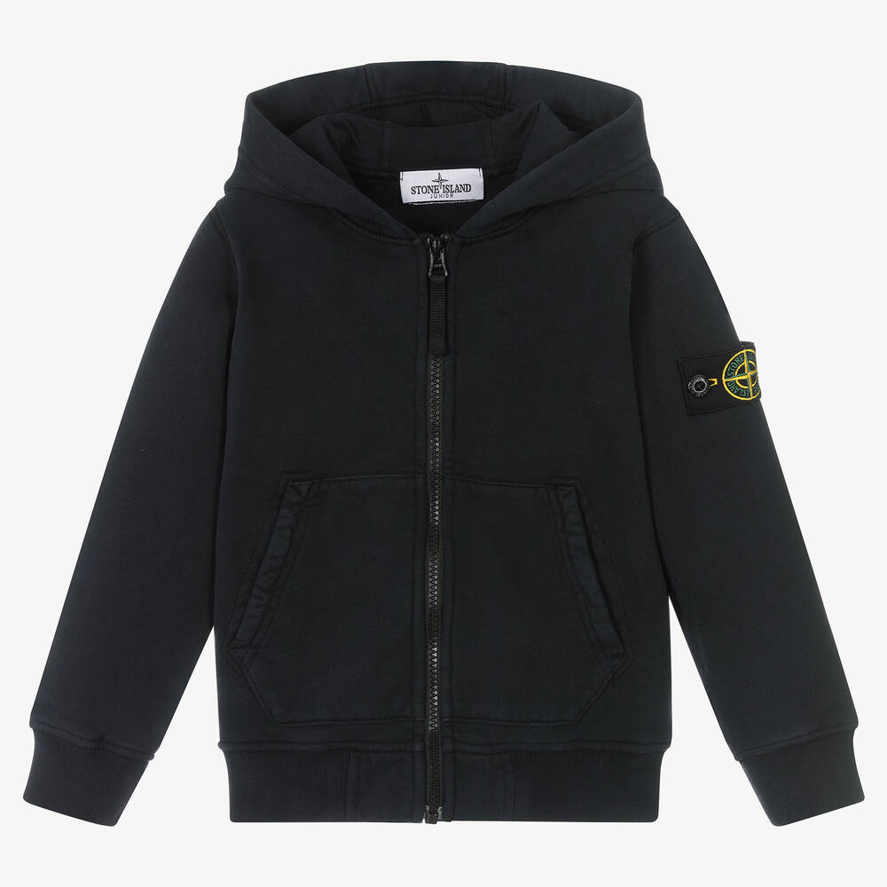 Navy blue zip-up hooded top for boys from Stone Island Junior. Made in soft, mid-weight cotton jersey, this comfortable and casual top has the brand's signature removable logo badge on one sleeve and a pouch pocket on the front.
