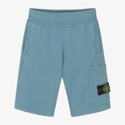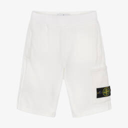 White shorts for boys by Stone Island Junior, with the designer's removable Compass logo patch on one leg for instant brand recognition. Made in soft organic cotton jersey for casual comfort, they have a gently elasticated waist with an inner drawstring tie and three useful pockets.