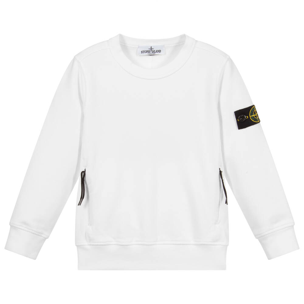 White sweatshirt for younger boys by Stone Island Junior, made in soft and stretchy cotton jersey with a fleecy underside. There are two side zip pockets and a removable black embroidered logo patch on one sleeve.