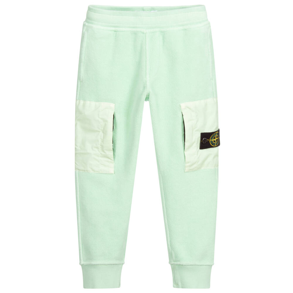 Boys pale green polar fleece joggers by Stone Island Junior. Mid-weight and warm, they have a soft feel and a ribbed waistband and ankle cuffs. There are two side pockets and two cotton cargo-style pockets with concealed zips, one with the brand's removable logo badge. They have an internal adjustable waistband and a pocket on the back.