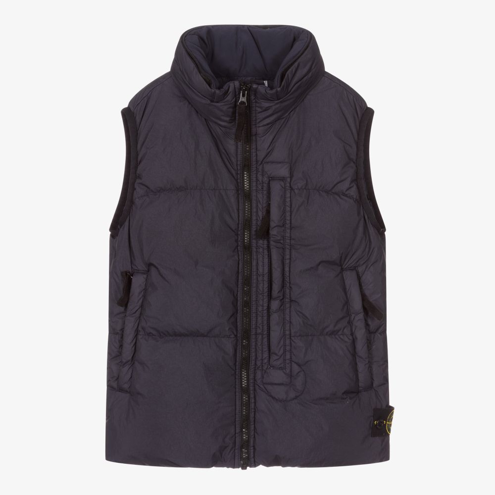 Navy blue puffer gilet for teen boys by Italian designer Stone Island Junior. Soft and silky with warm down padding, it has three useful zipped pockets on the front and the brand's signature removable logo badge on one side. This gilet has a hood that folds away into the collar.