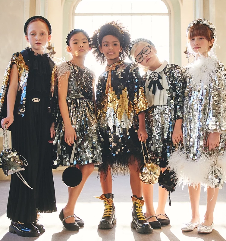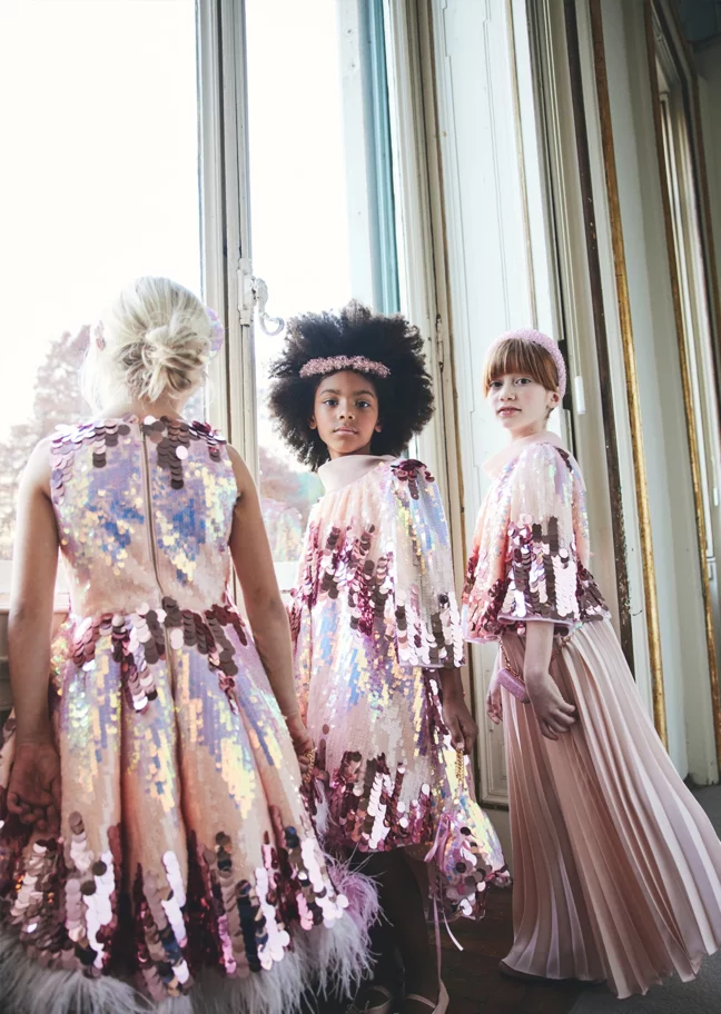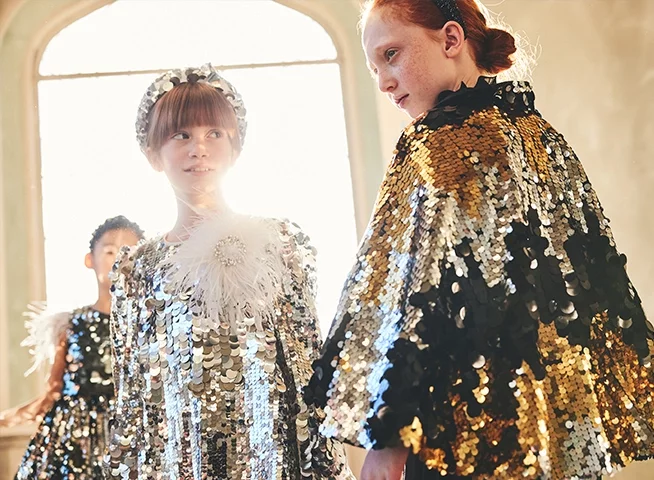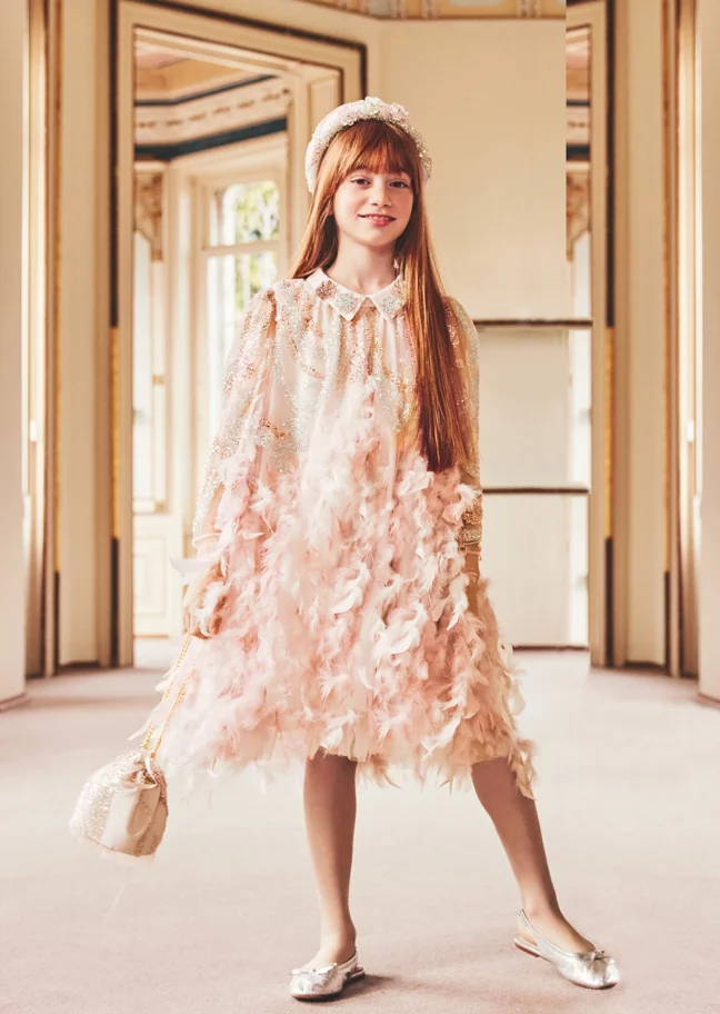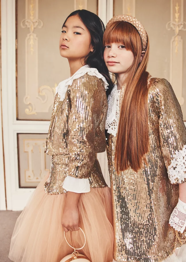 Creative collaboration is hugely important to Childrensalon, and the limited-edition pieces created in partnership with Junona are always highly anticipated. “Our exclusive pieces for Childrensalon are seriously something else!” enthuses Petya, “They're super special because they show off Junona's unique and elevated style, but they're made just for the Childrensalon crowd. They’re adorned with exquisite details and crafted from premium materials with impeccable craftsmanship, making them absolute must-haves." And this season’s offering is just as beautiful as we’d imagined: two show-stopping jumpsuits, one in head-to-toe golden sequins and lace, and the other, a vision in feathers and shimmering ivory paillettes, both perfect for her next big event. Simply spectacular!