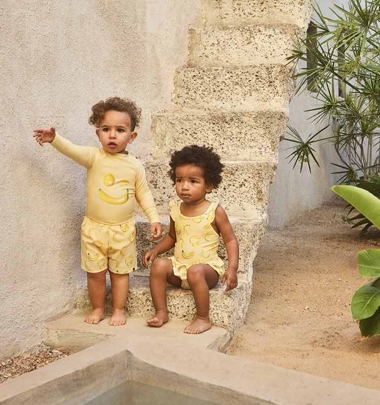 Your baby’s skin is highly sensitive to the sun’s rays, and using sunscreen alone is often not enough protection. UV-protective swimwear is a must-have for babies when on the beach or by the pool. Look out for the UPF40+ and UPF50+ tags on our swimwear, which offer optimum levels of protection for your little one — UPF50+ fabric blocks 98% of harmful rays and many designs with this feature also offer added protection in the form of longer sleeves and legs, and higher necklines.