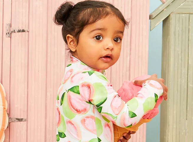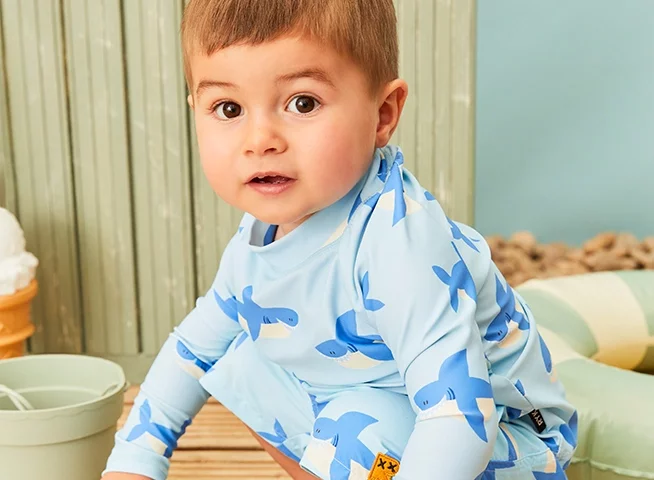 Your baby’s skin is highly sensitive to the sun’s rays, and using sunscreen alone is often not enough protection. UV-protective swimwear is a must-have for babies when on the beach or by the pool. Look out for the UPF40+ and UPF50+ tags on our swimwear, which offer optimum levels of protection for your little one — UPF50+ fabric blocks 98% of harmful rays and many designs with this feature also offer added protection in the form of longer sleeves and legs, and higher necklines.