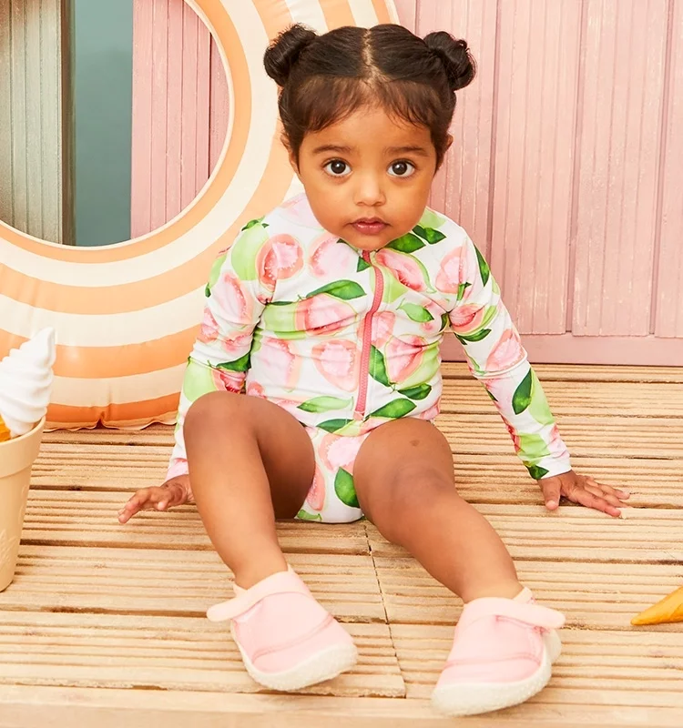 Choosing the right sun-protective baby swimwear will help shield their delicate skin from harmful UV rays, and we've got lots of sunny styles to choose from. Plus, our range of float suits and swim aids will also offer added peace of mind when they are bobbing around in the water. So, pack your suitcases and read on for our top tips when shopping for your baby's swimwear here at Childrensalon.
