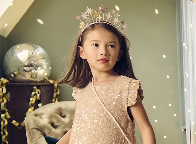 Discover metallic fabrics that shimmer and shine with every twirl, like this gold Abel & Lula plissé skirt set, head-to-toe sequins and bows, as seen on this beautiful Phi clothing two-piece (which are as comfy as pyjamas), and if she prefers something a little more pared back, then Patachou’s tweed dress will see out the year in style. And to complete her New Year’s Eve look, head to our accessories collection for star-spangled hair clips, shoes, bags and more little touches that will have her feeling like the belle of the ball as the clock strikes midnight.