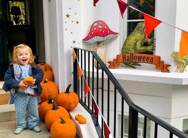 “Every year I decorate the outside of the house in a big way. I like it to look as though Halloween is cascading out of the doors and windows, so sometimes that means there’s a lot of greenery — boughs of hops, corn, plentiful pumpkins (obviously), especially mini ones, ribbon streamers. Some years it’s bunting in autumnal colours coming from the top of the house all the way down! One year, I filled lots of jam jars with twinkly lights and tied magic labels to them all. I have a collection of giant cut-out toads, spooky signs, stars and moons; I never do anything ghoulish, I keep it pretty cheerful (no bones, no zombies, no police tape). Decorating the exterior helps with that dreary period between back-to-school and Christmas, when it’s suddenly dark at 4 pm and everything feels gloomy. Anything that lifts the spirits and feels festive is worth indulging, I think.”