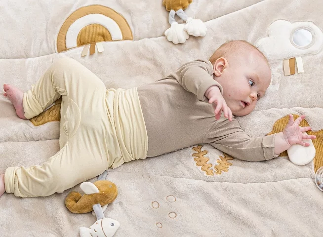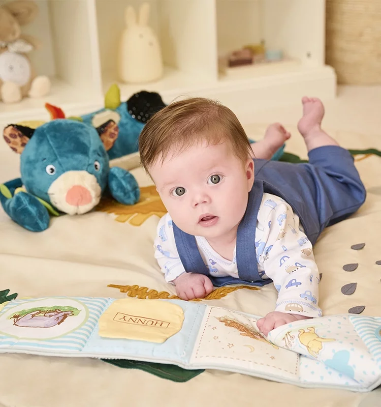 Whilst their vision is still a little fuzzy in those early weeks, your baby will start seeing the world through their fingertips. Tactility plays a major role in their development and helps in the formation of skills such as gripping and clapping. And from around 3 months old, they will be able to identify nearby objects and attempt to touch them, referred to as visually directed reaching. At this stage, they’ll likely be grabbing on to anything (and everything) — this is where a sensory toy comes in handy. Activity toys and rattles are a great idea for sensory playtime, especially designs that encourage hand-eye coordination and using both hands simultaneously. It takes practice to coordinate the dual function of both hands, so it’s a big step for tiny ones. This usually occurs at around 4 to 5 months old, so be prepared with a play cushion from Sophie la Girafe or a soft book from Rainbow Designs.