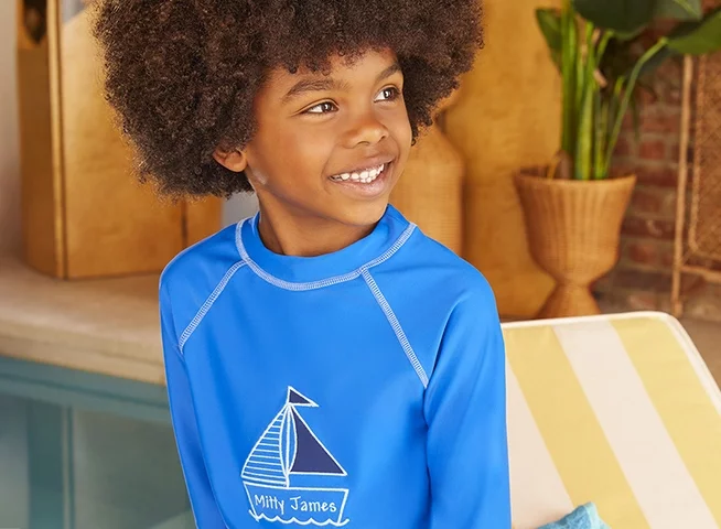 Now, when it comes to enjoying the summer holidays, sun safety is key, and for added peace of mind, many of our swim styles are made from UPF50+ fabric, which blocks 98% of the sun’s harmful rays from reaching your child’s skin. Coupled with long sleeves for extra coverage, this Mitty James sun-safe top is a must-pack this season, paired with striped swim shorts.